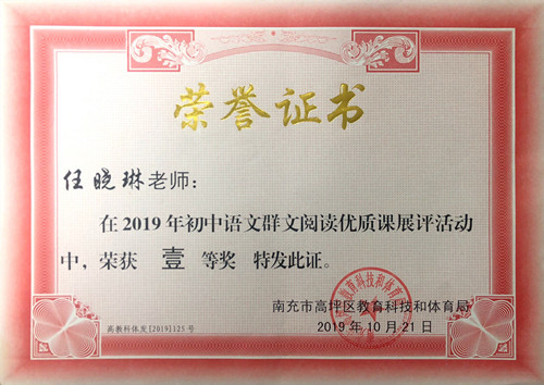 熱烈祝賀任曉琳老師在2019年初中語文群文閱讀優(yōu)質(zhì)課展評活動中榮獲“一等獎” ...