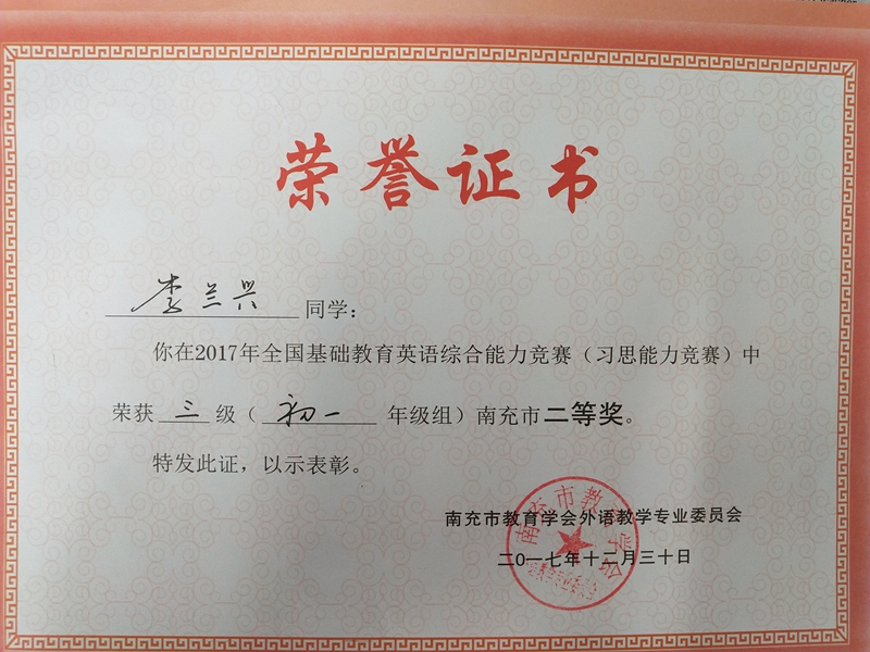 我校初中學(xué)生全市英語(yǔ)競(jìng)賽獲獎(jiǎng)證書